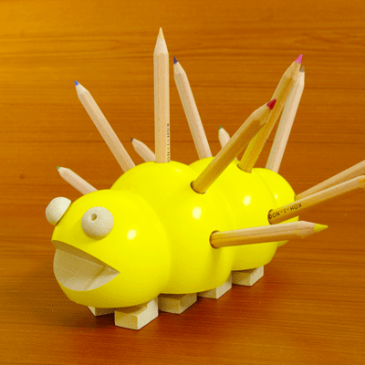 【名入れ無料】チェコスロバキア製 机の上を楽しくする コヒノール イモムシ型 木製色鉛筆スタンド(黄)